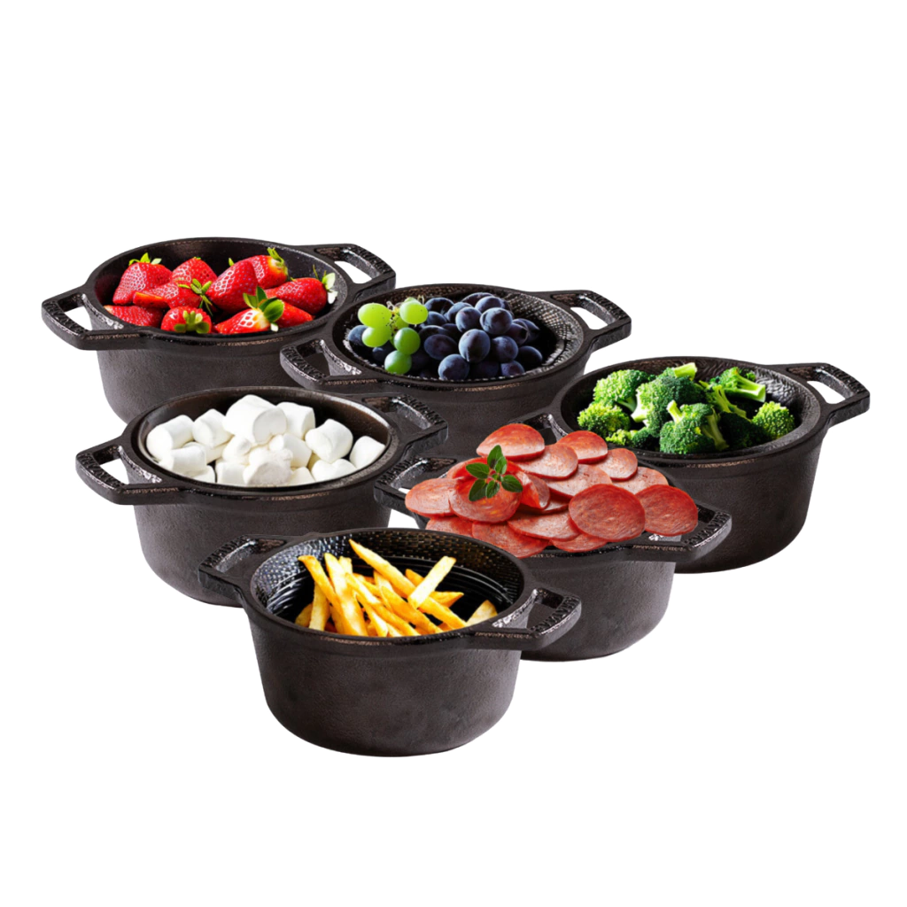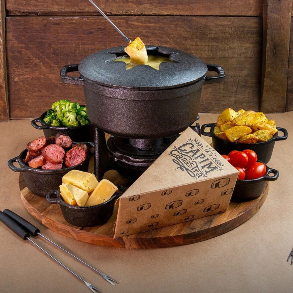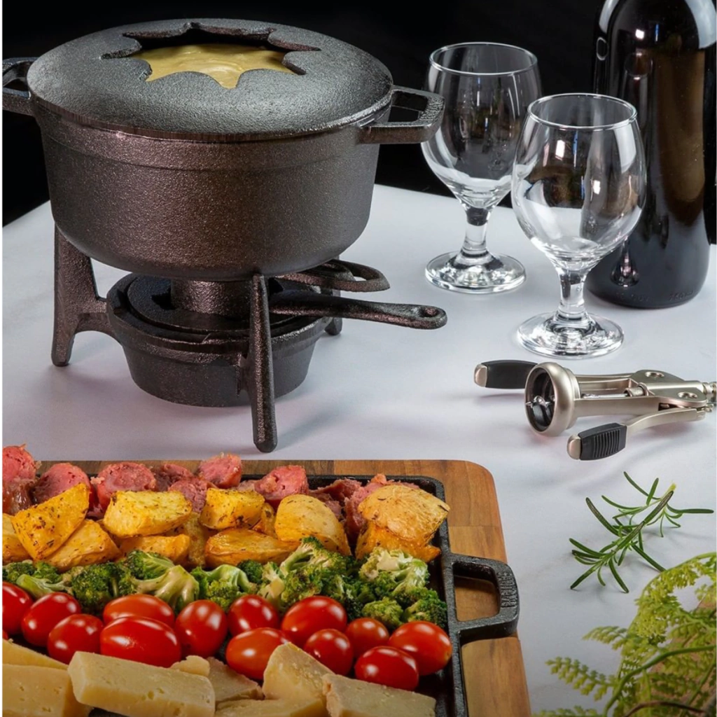 Kit 2 Fondues com Réchaud, Chapa de Ferro Fundido e 6 Malgas - Compartilhe Delícias e Crie Momentos Inesquecíveis!