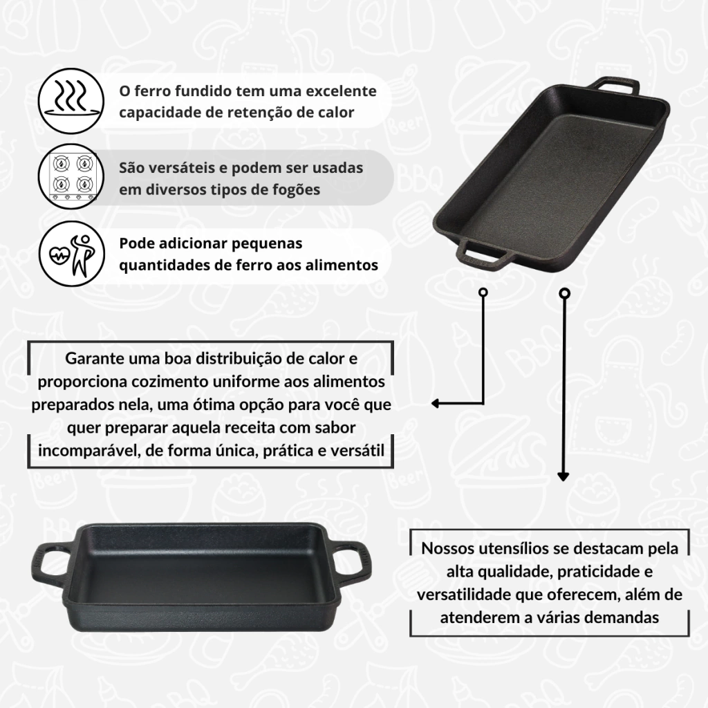 E tem mais, se você quer investir em um produto durável, versátil e resistente, a Assadeira Facile é uma ótima escolha, além de atender a todos esses requisitos, este utensílio, assim como os demais produtos de ferro da Santana, contribui para que você tenha uma alimentação mais saudável, já que como você já sabe, uma quantidade benéfica do mineral ferro é transferida para os alimentos durante o seu preparo. A Assadeira Facile também é excelente para aquecer e conservar a temperatura dos alimentos, além de proporcionar um cozimento uniforme dos mesmos.
