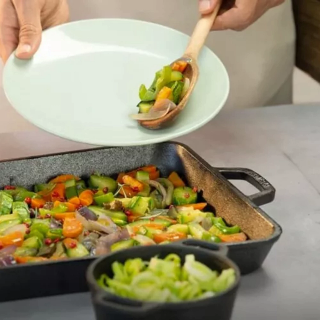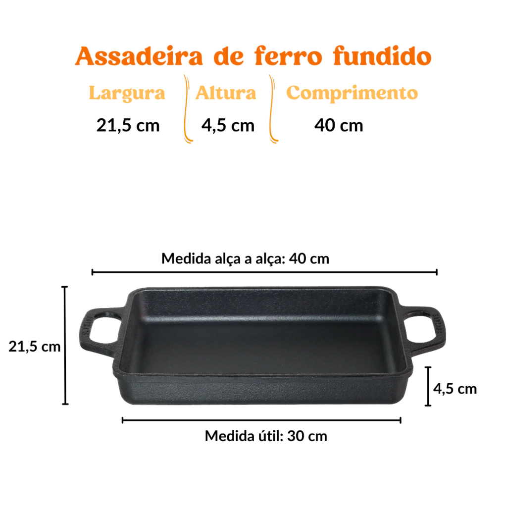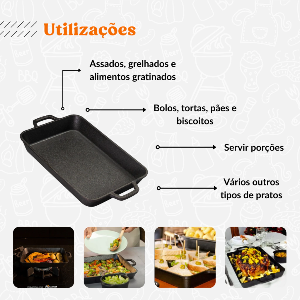 Enfim, como você pode ver, a Assadeira Gourmet é uma ótima opção para você que quer preparar aquela receita com sabor incomparável, de forma única, prática e versátil. E não podemos deixar de mencionar que, a Assadeira Gourmet, assim como os demais produtos de ferro da Santana, conta com acabamento feito com revestimento 100% vegetal, por meio de um processo totalmente natural e livre de químicas, o que contribui de forma significativa com a sustentabilidade e também com o cuidado com a sua saúde.