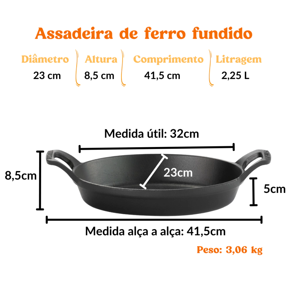 Tamanho da assadeira (Diâmetro x Comprimento x Altura):23Ø x 41,5 x 8,5cm