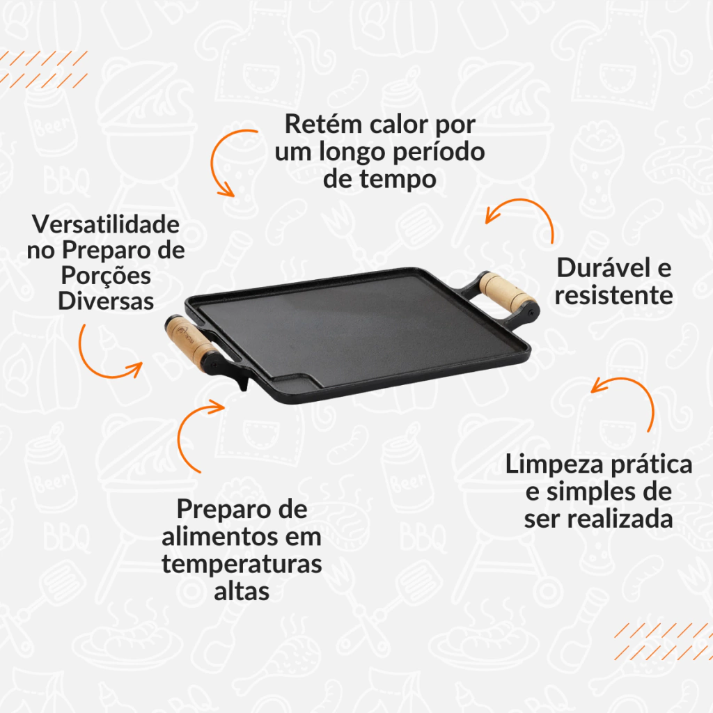 A Bifeteira Lisa da Santana possui 2 alças de madeira, além de uma estrutura com chapa lisa retangular feita em ferro fundido altamente durável, com garantia de durabilidade e resistência, sua dimensão equivale a 24 x 2 x 38 cm. Nossa chapa de ferro lisa é ideal para o preparo de carnes, pães, ovos, legumes, peixes, entre vários outros alimentos relacionados. Este modelo de bifeteira lisa é muito utilizado em bares e restaurantes, sendo extremamente útil e funcional para preparar e servir porções de carnes e demais petiscos, tendo em vista que é capaz de manter os alimentos aquecidos por muito mais tempo, por ser o ferro de sua composição, um ótimo condutor de calor. Nossos utensílios se destacam pela alta qualidade, praticidade e versatilidade que oferecem, além de atenderem a várias demandas. Você pode utilizá-los em todos os tipos de fogão, desde o fogão a gás, como também a lenha, elétrico e também em cooktop de indução.