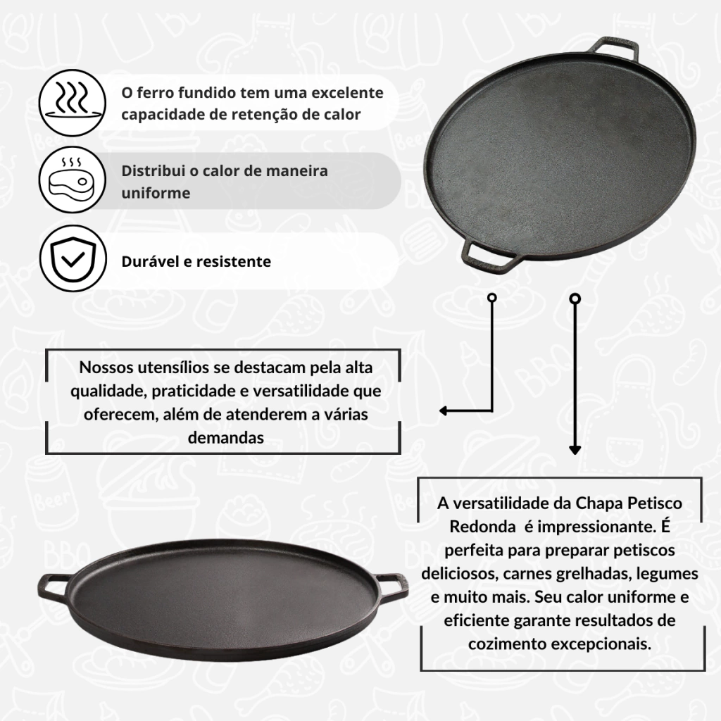 A Chapa e Forma de Ferro Fundido é o complemento perfeito para a sua cozinha, unindo estilo, praticidade e versatilidade em um único utensílio. Fabricada com a tradicional qualidade dos produtos de ferro fundido, este item proporciona uma experiência culinária superior, seja para grelhar carnes, legumes ou preparar deliciosas pizzas.