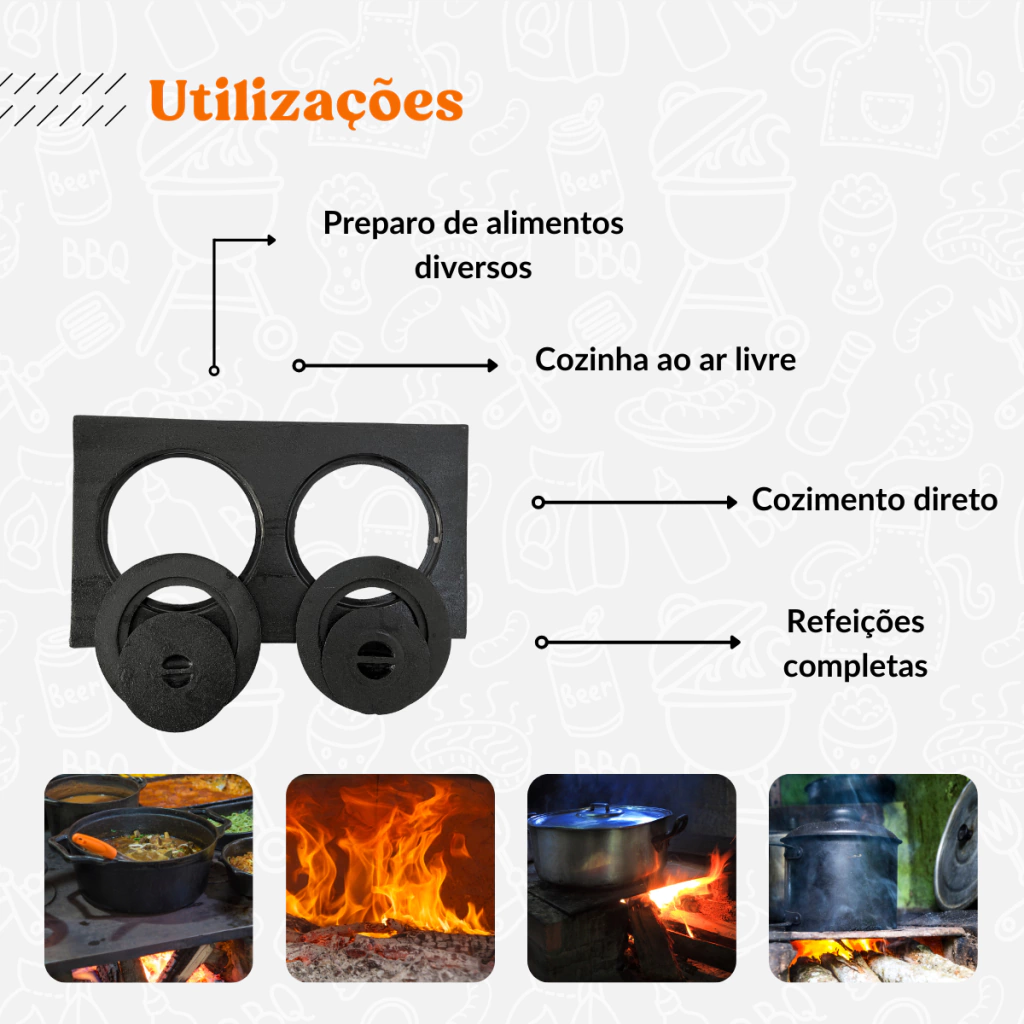 Durabilidade e tradição: Fabricada com materiais de alta qualidade, a Chapa Mineira 2 Furos com Redução e Tampa é sinônimo de durabilidade e resistência. Ela foi projetada para suportar o uso frequente e intensivo, garantindo uma vida útil prolongada. Além disso, sua fabricação em ferro fundido resgata a tradição da culinária no fogão a lenha, adicionando charme e autenticidade à sua cozinha.