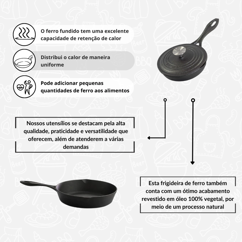 Este novo modelo de frigideira de ferro, além de acrescentar mais beleza a sua mesa e facilidade no preparo dos pratos, também conta com garantia de qualidade, resistência e durabilidade. Além de contribuir para uma alimentação mais saudável, devido a sua capacidade natural de transferência de porcentagens significativas de ferro para os alimentos preparados nela.