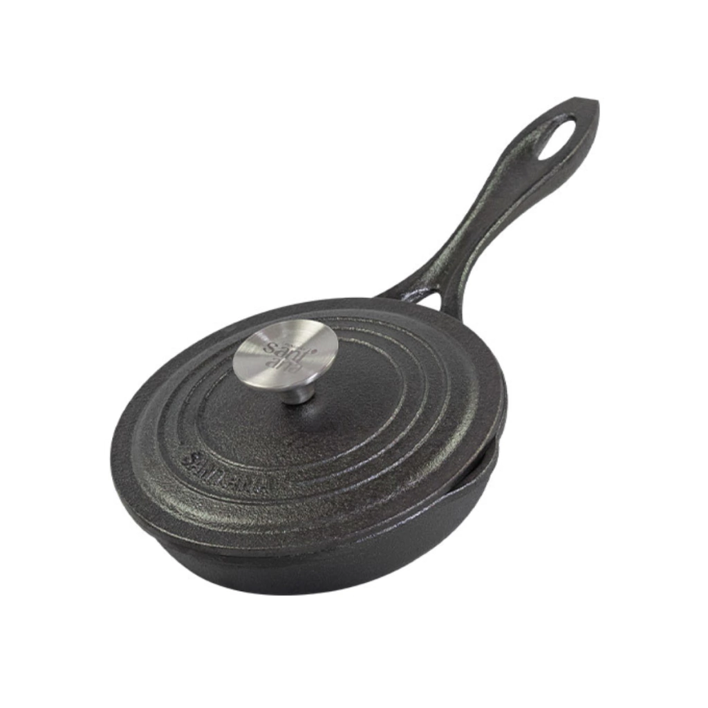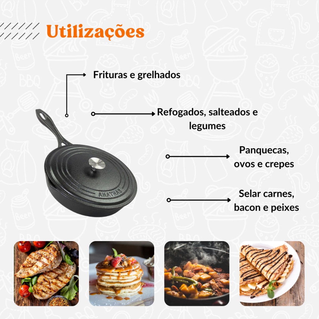 A frigideira Líder com tampa de ferro da Santana é ideal para o preparo de variados pratos como ovos, carnes, legumes, dentre diversos outros tipos de alimentos grelhados, de forma prática e eficiente. Esta frigideira com tampa de ferro encontra-se disponível nos modelos com e sem alça, seu cabo de fácil pegada oferece muito mais conforto nos preparos de diferentes tipos de receitas em seu dia a dia. Além disso, a estrutura desta frigideira de ferro fundido possui bordas arredondadas, o que facilita muito na hora da limpeza e manuseio desse incrível produto.