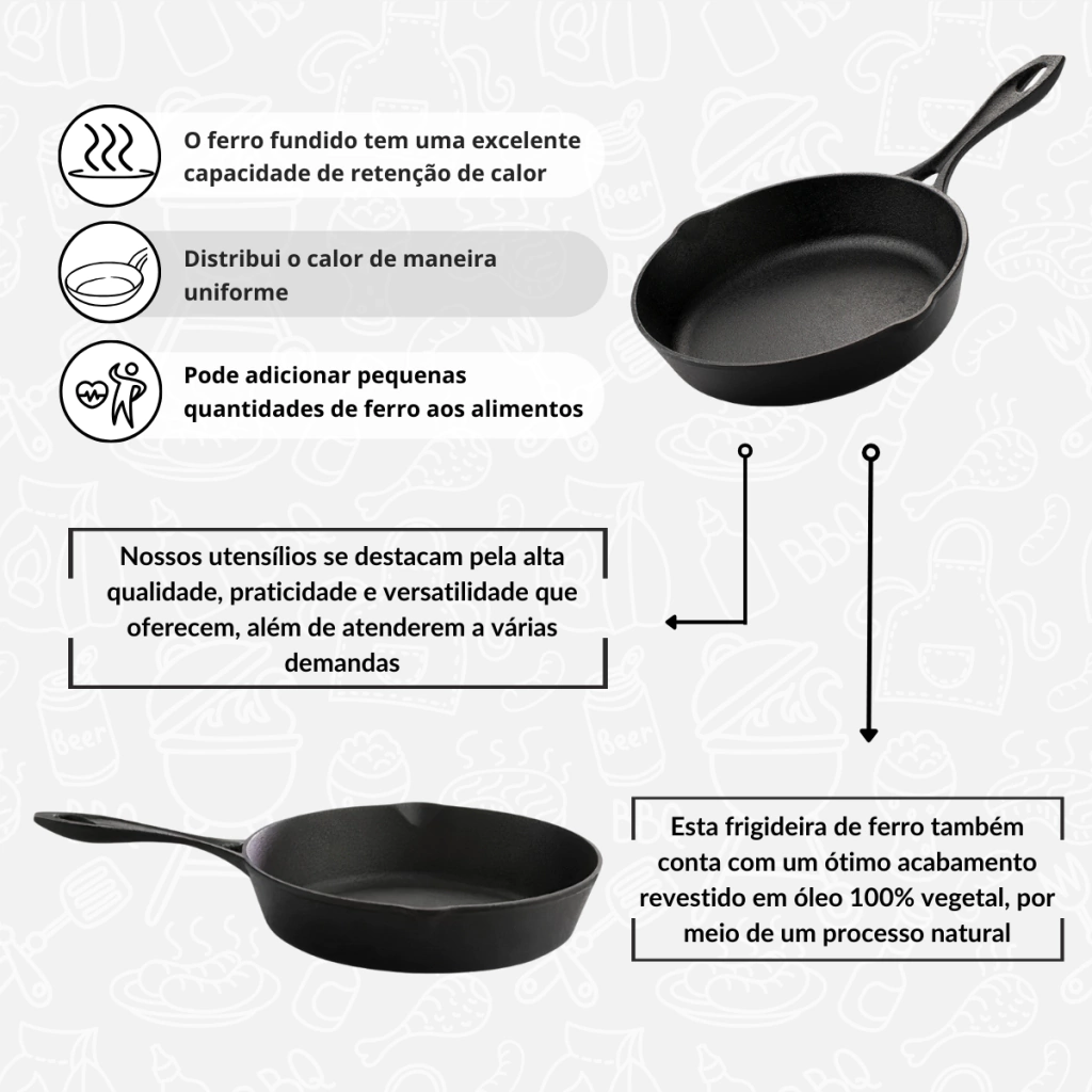 Além disso, a estrutura desta frigideira de ferro fundido possui bordas arredondadas que facilitam muito na hora da limpeza e manuseio do produto, tendo em vista que este conta com uma alça e também cabo de ferro bem delineados, para uma melhor utilização, com mais estabilidade. Esta frigideira de ferro também conta com um ótimo acabamento revestido em óleo 100% vegetal, por meio de um processo natural, que não prejudica a sua saúde e também contribui com a sustentabilidade.