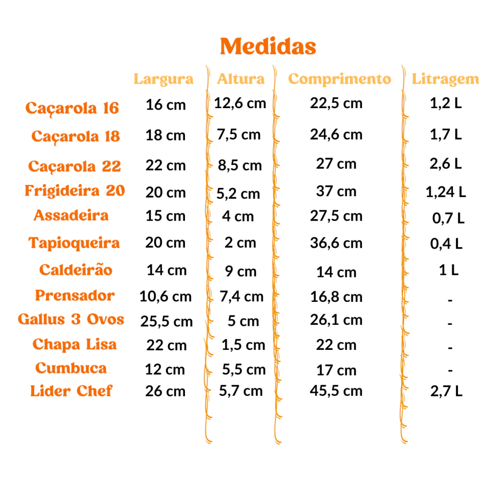 Caçarola 16: (Diâmetro x Comprimento x Altura) 16Ø x 26 cm x 7,5 cm | Litragem: 1,2 L