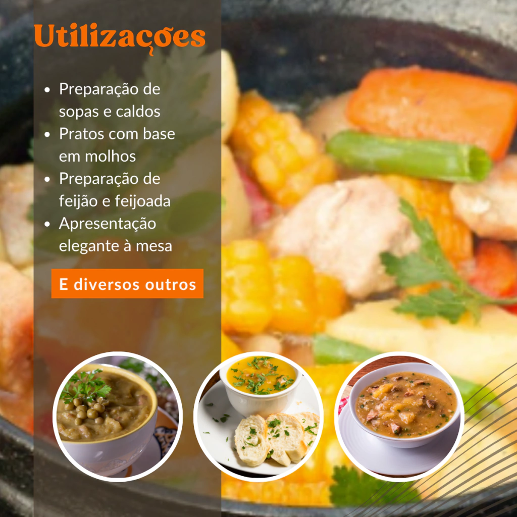 Versatilidade na Cozinha: Sem tampa, é ideal para uma variedade de pratos, desde sopas e ensopados individuais até pequenas receitas assadas. Adequado para uso no fogão, forno ou até mesmo em uma fogueira ao ar livre.