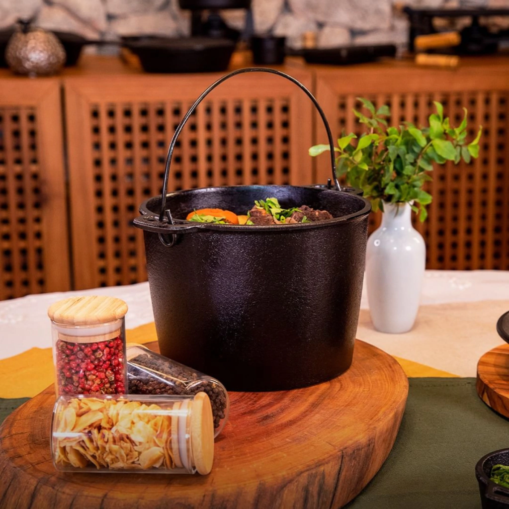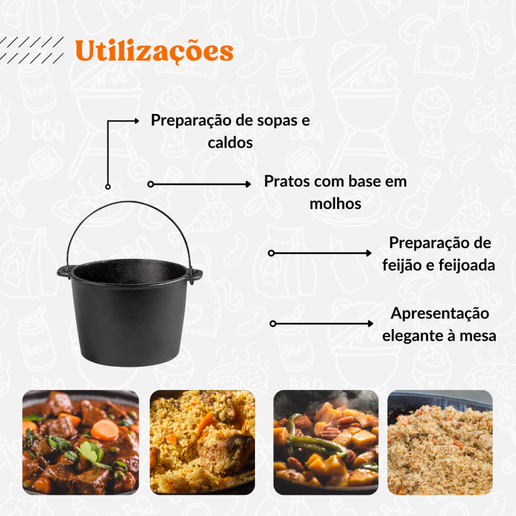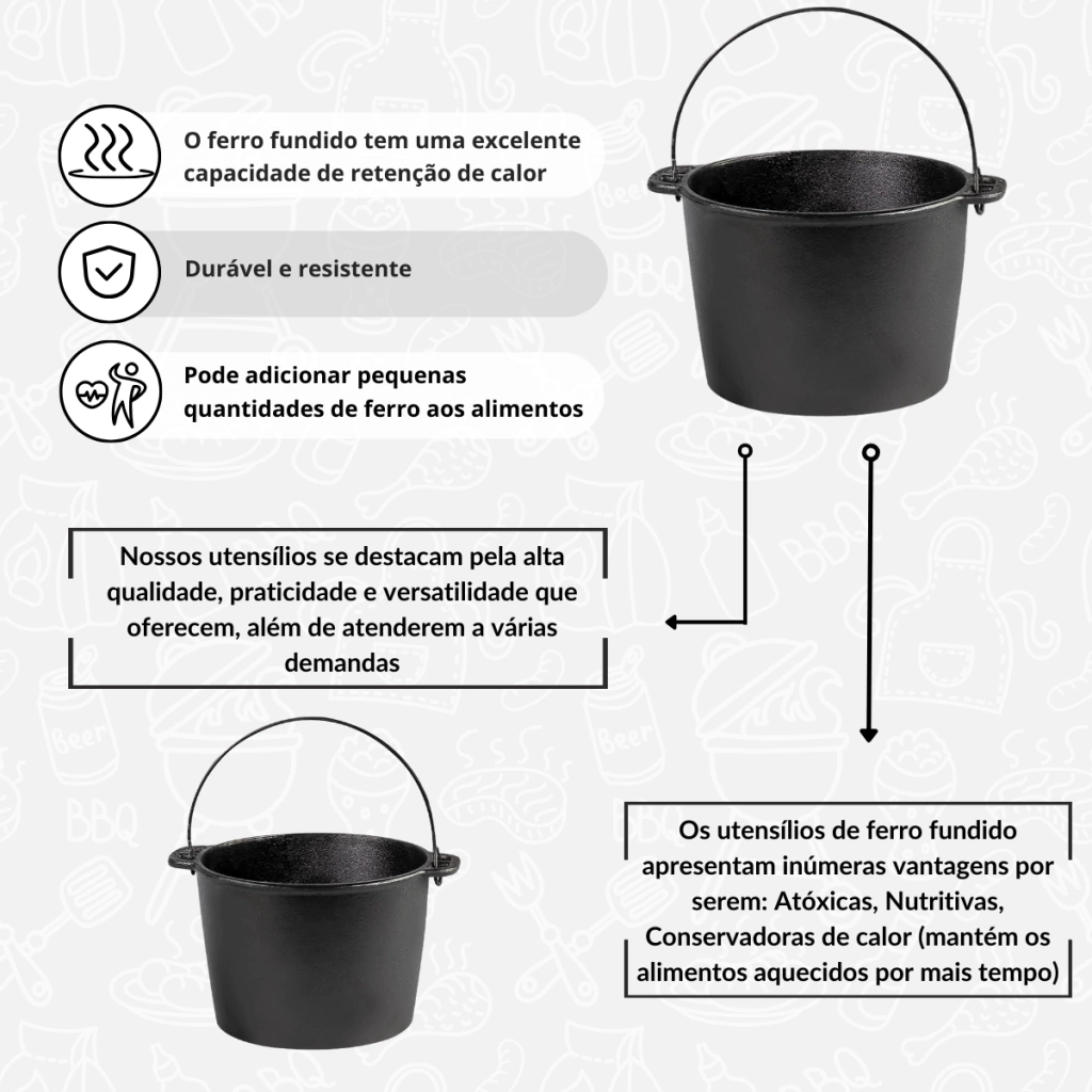 Durabilidade a Longo Prazo: Este caldeirão é feito para suportar o uso intensivo. A robustez do ferro fundido garante que seu utensílio seja um companheiro fiel nas suas aventuras culinárias por muitos anos.