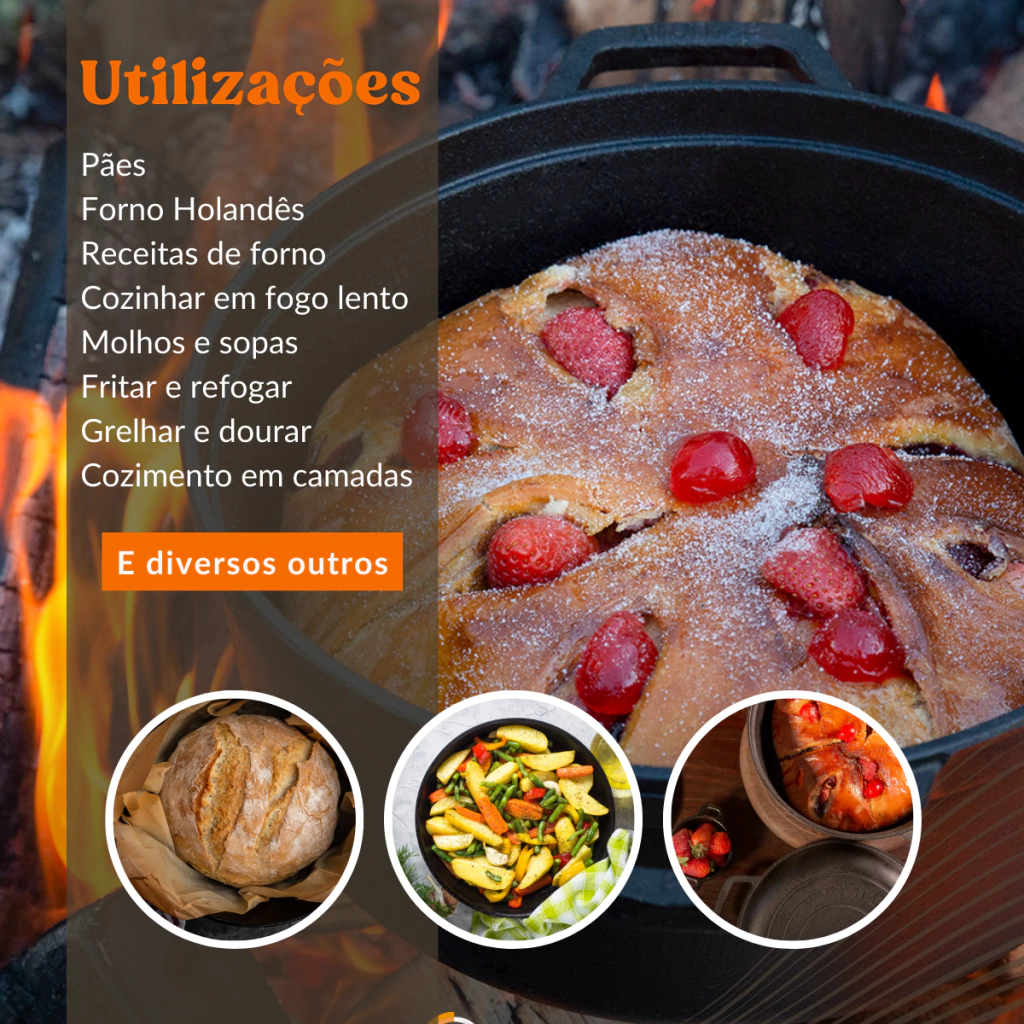 A caçarola Duo é também conhecida como Dutch Oven, sendo ideal para o preparo de pães e demais receitas de forno, além de ser altamente recomendada para uso em acampamentos, dentre outras atividades de camping. Viu só? Não importa se o seu perfil culinário é o de cozinhar em fogão a gás, à lenha, de indução, ou inclusive em locais improvisados de acampamento, com a Caçarola Duo você consegue preparar incríveis e deliciosas receitas, de forma prática, eficiente e incomparável!