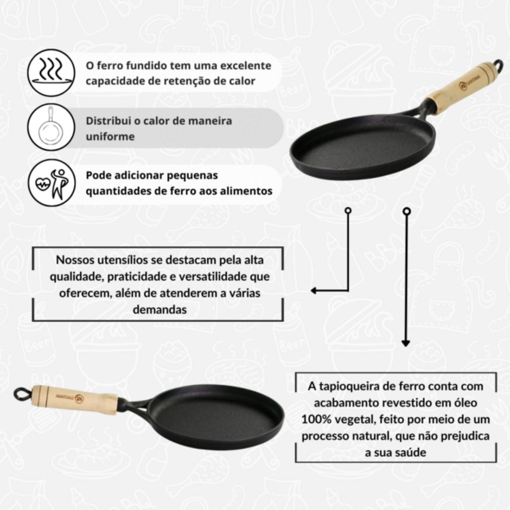 O kit ideal para quem ama uma boa tapioca! Com a tapioqueira de ferro fundido, você garante uma cocção uniforme, mantendo o sabor e a textura da massa. Seu cabo de madeira oferece segurança e conforto térmico. Já a peneira polvilhador permite armazenar até 500g de goma, facilitando a aplicação direta e uniforme sobre a frigideira, sem grumos ou desperdício. A tapioqueira pode ser usada em qualquer tipo de fogão, inclusive indução, e possui acabamento 100% vegetal, livre de químicos. O conjunto é fácil de usar, limpar e ideal para uso doméstico ou profissional. Medidas da tapioqueira: 18Ø x 36 x 2 cm. Peso: 1,220kg.
